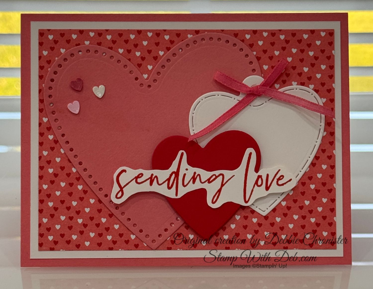 This card features the Product of the Month, Fabulous Sayings, paired with the Endless Love Dies. It’s a quick and easy card that really highlights the beauty of the Made With Love Designer Series Paper. Flirty Flamingo and Poppy Parade are the perfect cardstock colors to coordinate with this DSP. To create a custom matching ribbon, I colored the Bubble Bath 1/8" Faux Linen Ribbon with the Flirty Flamingo Light Stampin’ Blend. Finish the card with a touch of sparkle using the Loose Valentines Assortment embellishments.